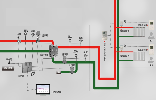 客户端均温调控系统将户端调节阀、温控面板的数据通过系统上传到采购单位控制机房,并与采购单位已有收费系统、客服系统、集抄系统、SCADA系统、信息化综合管理平台实现对接,最终实现项目单元及末端用户的二网平衡均温效果,达到既定热负荷目标。